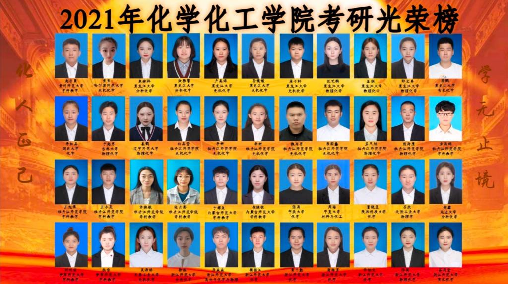 2021年04月29日更新 浏览次 BETVICTOR伟德2021届考研光荣榜 序号 姓名 升公司校 研究生专业 1 赵宇豪 贵州师范大学 学科教学(化学) 2 崔玉 哈尔滨师范大学 无机化学专业 3 惠婉婷 黑龙江大学 分析化学专业 4 汝雅馨 黑龙江大学 分析化学专业 5 卢美婷 黑龙江大学 无机化学专业 6 孙媛媛 黑龙江大学 无机化学专业 7 唐子轩 黑龙江大学 无机化学专业 8 范艺鹤 黑龙江大学 物理化学专业 9 王娟 黑龙江大学 物理化学专业 10 郑文秀 黑龙江大学 物理化学专业 11 顾鹏 黑龙江大学 有机化学专业 12 李红晶 湖北大学 化学专业 13 于超男 吉林大学 物理化学专业 14 姜鹤 辽宁师范大学 物理化学专业 15 初晶莹 BETVICTOR 无机化学专业 16 李妍 BETVICTOR 无机化学专业 17 李妍 BETVICTOR 无机化学专业 18 魏存宇 BETVICTOR 无机化学专业 19 崔国鑫 BETVICTOR 无机化学专业 20 孟凡旭 BETVICTOR 物理化学专业 21 熊海鹰 BETVICTOR 物理化学专业 22 宋雨婷 BETVICTOR 学科教学(化学) 23 王旭博 BETVICTOR 学科教学(化学) 24 王永亮 BETVICTOR 学科教学(化学) 25 许晓航 BETVICTOR 学科教学(化学) 26 张月影 BETVICTOR 学科教学(化学) 27 于耀泉 内蒙古师范大学 学科教学(化学) 28 侯晓锐 内蒙古师范大学 学科教学(化学) 29 张雨 宁波大学 化学专业 30 周瑶 宁夏大学 材料与化工专业 31 董晓昱 陕西科技大学 化学专业 32 吕欣 沈阳工业大学 物理学专业 33 徐鑫 延边大学 分析化学专业 34 刘明丽 伊犁师范大学 学科教学(化学) 35 杨雪 伊犁师范大学 学科教学(化学) 36 吴海娇 长春工业大学 无机化学专业 37 徐扬 浙江师范大学 分析化学专业 38 原焱焱 浙江师范大学 高分子化学与物理专业 39 樊锁江 浙江师范大学 化学专业 40 黄子懿 浙江师范大学 化学专业 41 唐梅芳 浙江师范大学 化学专业 42 许铂文 浙江师范大学 化学专业 43 张萌 浙江师范大学 物理化学专业 44 茹莉莹 浙江师范大学 有机化学专业