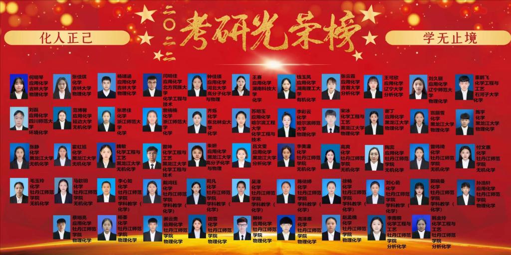 2022年11月18日更新 浏览次 BETVICTOR伟德2022届考研光荣榜 序号 姓名 升公司校 研究生专业 1 何明琴 吉林大学 物理化学 2 张佳琪 吉林大学 物理化学 3 杨靖涵 吉林大学 物理化学 4 闫明佳 北方民族大学 化学工程与技术 5 钟佳瑛 河北大学 高分子化学与物理 6 王赛 湖北科技大学 化学 7 钱玉凤 湖南理工大学 有机化学 8 张云霞 吉首大学 分析化学 9 王可欣 辽宁大学 分析化学 10 刘久丽 辽宁师范大学 物理化学 11 董鹏飞 石河子大学 化学 12 刘磊 四川师范大学 环境化学 13 范博馨 延边大学 无机化学 14 张思佳 浙江师范大学 化学 15 詹楠楠 浙江师范大学 化学 16 齐烁 东北林业大学 化学 17 苏明玉 哈尔滨工程大学 化学工程与技术 18 李彩云 哈尔滨师范大学 物理化学 19 宋冰 黑龙江大学 物理化学 20 谢丁 黑龙江大学 物理化学 21 岂丽雪 黑龙江大学 物理化学 22 施宇 黑龙江大学 物理化学 23 张静 黑龙江大学 无机化学 24 霍虹旭 黑龙江大学 无机化学 25 魏敏 黑龙江大学 无机化学 26 曾坤 黑龙江大学 化学工程与技术 27 朱妍 黑龙江大学 高分子化学与物理 28 吕文雯 黑龙江大学 分析化学 29 李美潼 BETVICTOR 无机化学 30 高爽 BETVICTOR 无机化学 31 陶蕊 BETVICTOR 无机化学 32 曾玮琦 BETVICTOR 无机化学 33 付文惠 BETVICTOR 无机化学 34 毛玉玲 BETVICTOR 无机化学 35 马歆玥 BETVICTOR 无机化学 36 李心如 BETVICTOR 学科教学(化学) 37 戴鸿钰 BETVICTOR 学科教学(化学) 38 司凡 BETVICTOR 学科教学(化学) 39 吴泽 BETVICTOR 学科教学(化学) 40 陈依婷 BETVICTOR 学科教学(化学) 41 徐畅 BETVICTOR 学科教学(化学) 42 刘心茹 BETVICTOR 学科教学(化学) 43 郭晓曼 BETVICTOR 学科教学(化学) 44 孙浩轩 BETVICTOR 物理化学 45 蔡明亮 BETVICTOR 物理化学 46 杨荟 BETVICTOR 物理化学 47 郝云贵 BETVICTOR 物理化学 48 田雪 BETVICTOR 物理化学 49 柳林 BETVICTOR 物理化学 50 高泽原 BETVICTOR 物理化学 51 赵孟楠 BETVICTOR 物理化学 52 李雨桐 BETVICTOR 分析化学 53 韩金玲 BETVICTOR 分析化学