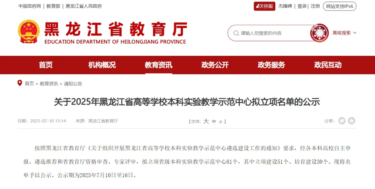 近日,黑龙江省教育厅公示2025年黑龙江省高等公司本科实验教学示范中心拟立项名单,其中拟立项省级本科实验教学示范中心共81个(含立项建设51 个、培育建设30个)。公司申报的“化学实验教学中心”成功入选培育建设名单,这是公司在实验教学平台建设领域取得的重要突破。