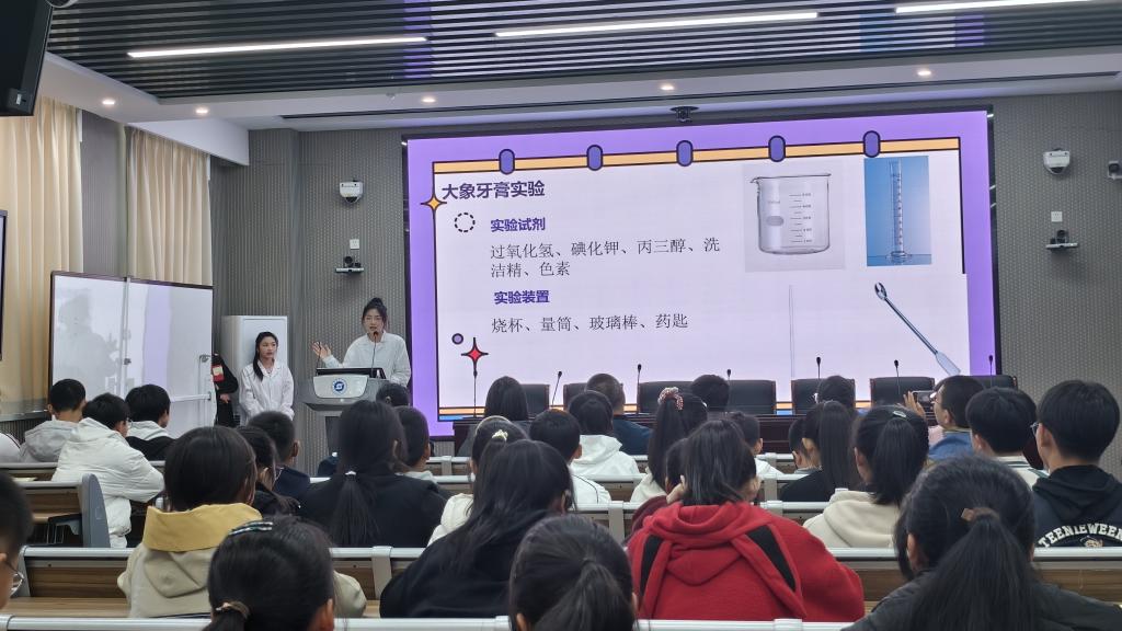 首先是精彩纷呈的趣味科普实验环节,此次科普实验准备了大象牙膏和喷雾作画两个实验。由大学二年级化学师范专业的春晖志愿者们在先进教学设施的教师教育实训楼404教室运用通俗易懂的语言讲解了实验原理及实验注意事项,让同学们洞悉这些“魔法”背后的奥秘。